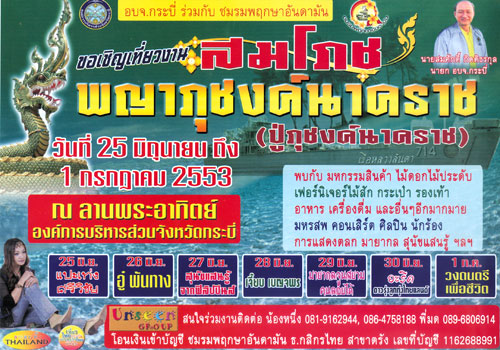 อบจ.กระบี่ ร่วมกับชมรมพฤกษาอันดามัน จัดพิธีบวงสรวงและสมโภชน์เฉลิมฉลองพญาภุชงค์นาคราช (ปู่ภุชงค์นาคราช) ระหว่างวันที่ 25 มิ.ย.-1 ก.ค.53 ณ ลานพระอาทิตย์ องค์การบริหารส่วนจังหวัดกระบี่ เชิญชมมหกรรมสินค้า และมหรสพมากมาย